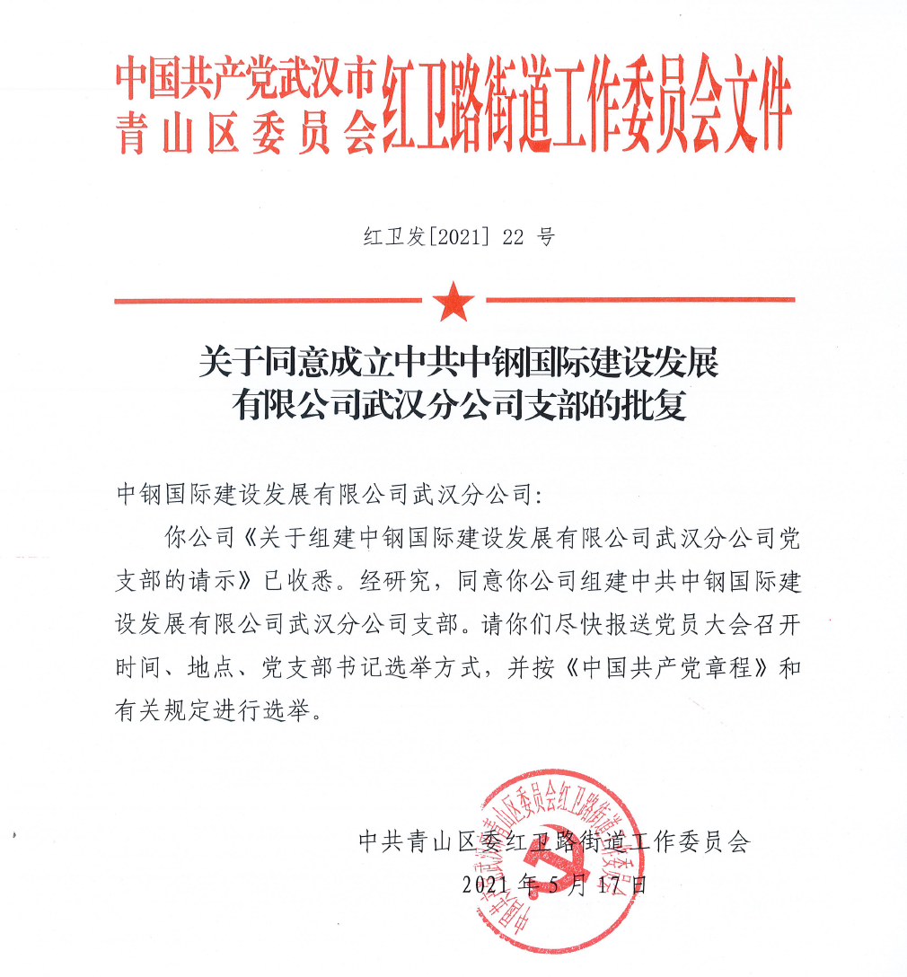5月25日,中共青山区委红卫路街道工作委员会审核决定,同意我司正式成立中钢国际建设发展有限公司武汉分公司党支部,并颁发了《关于同意成立中共中钢国际建设发展有限公司武汉分公司支部的批复》。